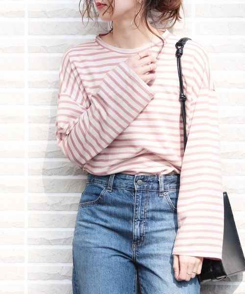 キュートなボーダーをチョイスするならピンクのボーダーもおすすめ!ゆったりとしたシルエットで、袖のボリューム感が女性らしさを強調し、淡めのカラーが甘すぎないコーデに仕上がり、おしゃれ度もグッと増しますよ。