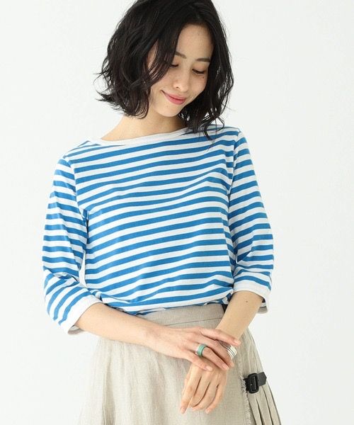 5分袖のボーダーアイテムをチェックするならこちらの7分袖のトップスもあわせてチェックしてみましょう!鮮やかなブルーが爽やかな印象を与え、手触りも滑らかなコットン素材がとっても気持ちいいアイテムです。