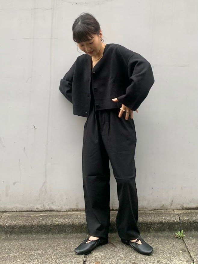 ブラックのカーディガンにメンズの黒パンツを合わせた、今っぽいオールブラックコーデ。ゆるっとしたメンズパンツも、黒ならすっきり見えるんです。合わせるカーディガンは、ボリュームのあるパンツとバランスが取りやすいショート丈が正解!