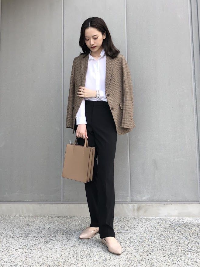 ユニクロのスマートアンクルパンツは、オンオフ問わず使える優れもの。センタープレスにテーパードシルエットで、脚長効果抜群なんです。秋色のチェック柄ジャケットを羽織り、体温調節しながらコーデの秋らしさを盛り上げるのがポイント!