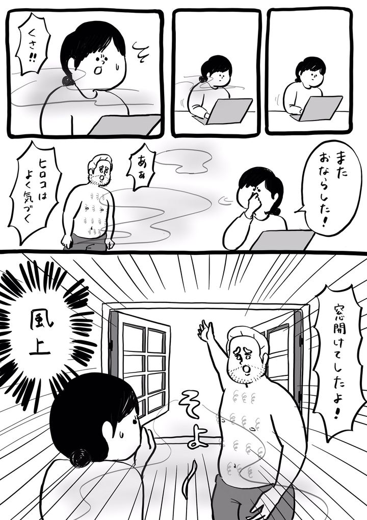 ガイックさんがおならをしたことに、いつもすぐに気が付いてしまう何食わぬ顔のヒロコさん。臭いに敏感な何食わぬ顔のヒロコさんを気遣って、ガイックさんは新たな策を講じましたが…