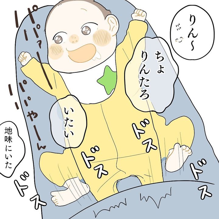 つよぴさんに会えた嬉しさでキックを何発も繰り出してしまうりんたろくん。どうやら「何時間かぶりに見るママやパパのお顔を見て大興奮」のようです。
