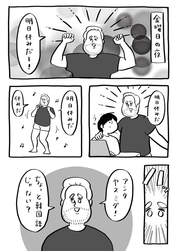 しばひろさんに報告したり踊ったりした後、「アシタヤスミダ!」が韓国語に近いと発見したガイックさん。