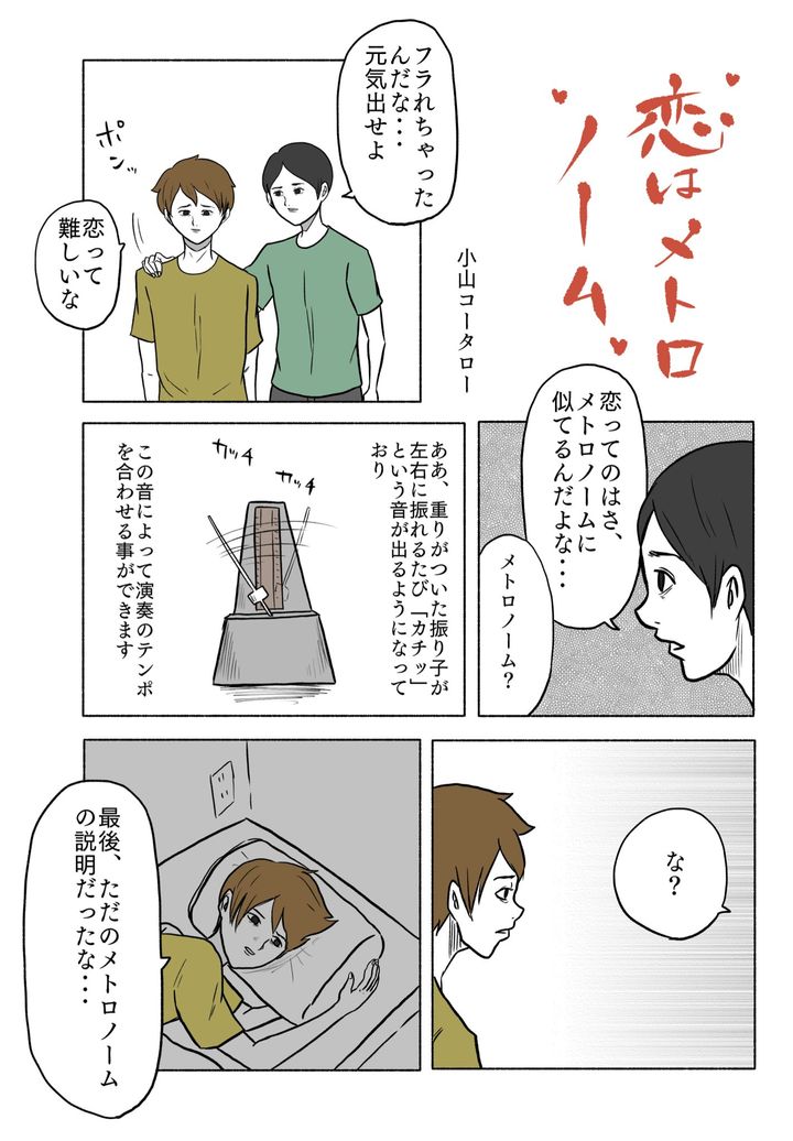「恋って難しいな」と肩を落とす男性に、友人がなにやら格言っぽいことを話し始めました。それは「恋ってのはさ、メトロノームに似てるんだよな」という話。揺れ動く二人の気持ちの例えかと思いきや、単にメトロノームという道具を説明しただけで終わりました。