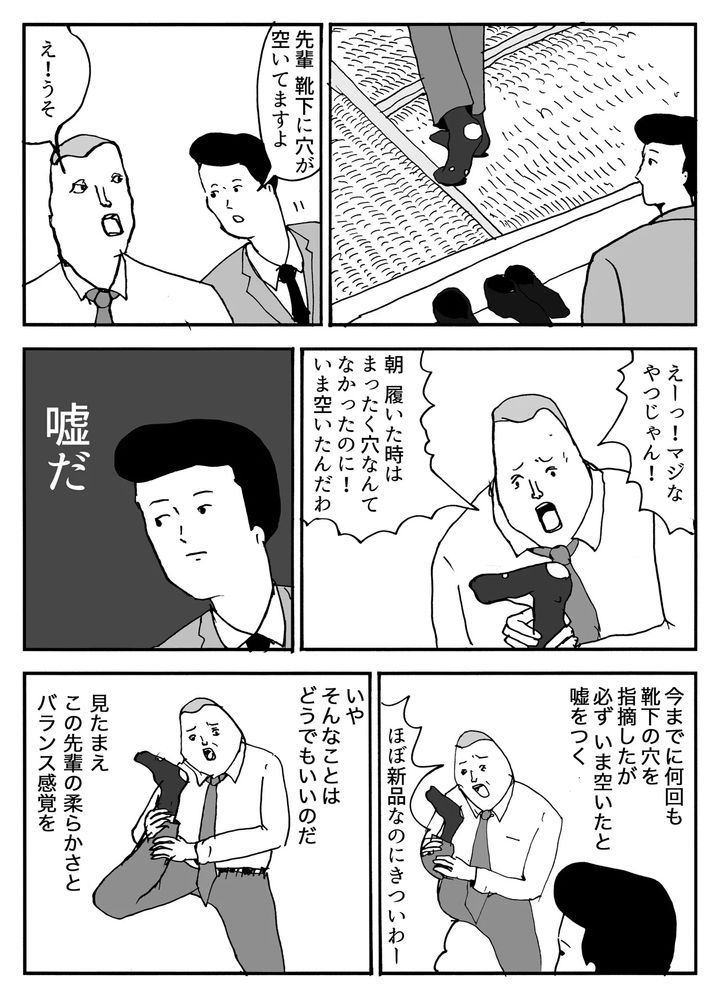 先輩の靴下に穴が開いていることを指摘する後輩。ところが、後輩が本当に気になっていたのは、靴下の穴ではなく、柔らかすぎる先輩の体と素晴らしいバランス感覚でした。