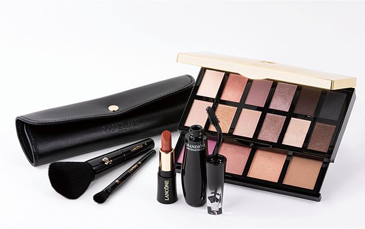 <セット内容>写真2/右から:2022 アイ アンド フェイス パレット(現品)、グランディオーズ 01(現品)、ラプソリュ ルージュ クリーム 274(試供用サイズ)、ランコム オリジナル ブラシ 2種(ケース付き)、ランコム オリジナル ヴァニティ