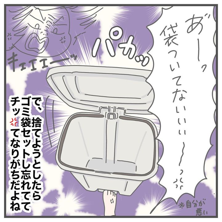 牛乳をこぼして拭き取ろうと思ったところ、取り出したティッシュも最後の1枚で、また新たなゴミが発生。そして、その空箱を捨てようとしたところ、新しいゴミ袋をセットし忘れていたことに気づき、イラ立ちが最高潮に達してしまいます!