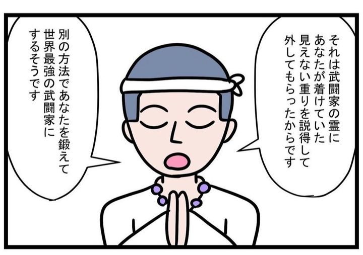ところが、残念ながら霊の悪影響は続いてしまいます…。重りを外した代わりに、今度は別の方法で女性を世界最強の武闘家に鍛え上げるのだそうです。