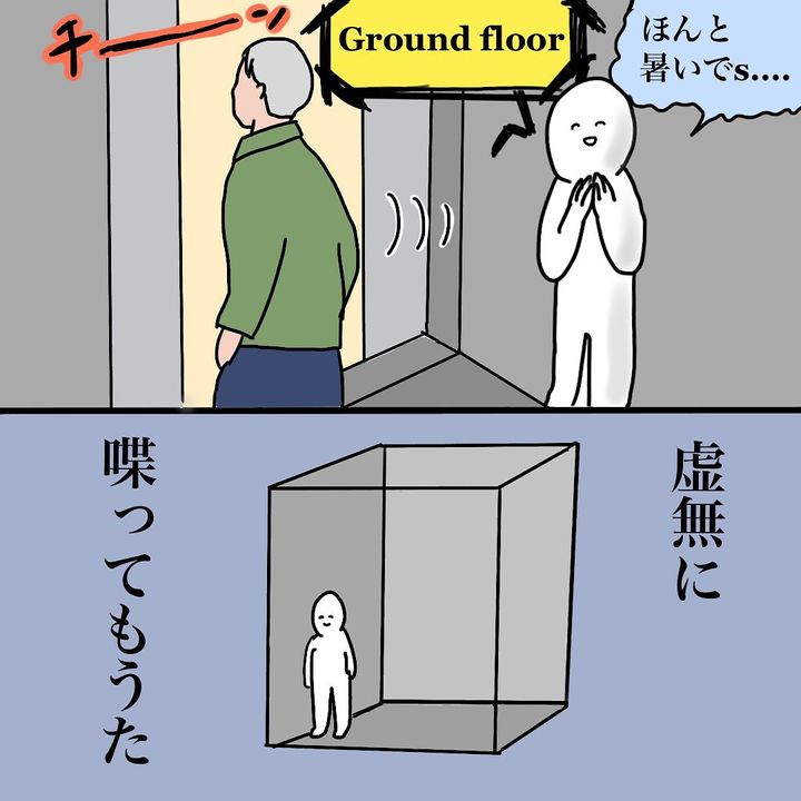 悩んだ挙句、同意の言葉を発しかけたおもちさんでしたが、男性は無言でエレベーターを降りていったのでした…。一人むなしくエレベーターに取り残されたおもちさん。結局、男性の独り言だったのでしょうか?