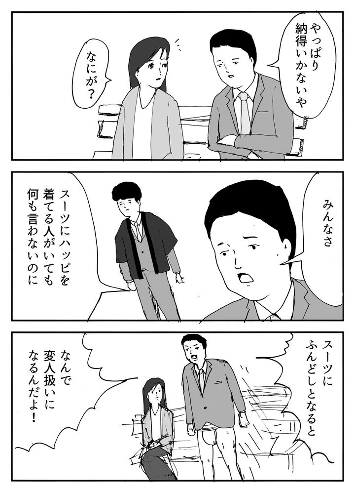 男性が納得いかないこととは、スーツにハッピを着るのはOKなのに、スーツとふんどしを合わせるのがNGとされる風潮のことでした。さらに、言葉で提言するだけでなく、自ら体を張って公衆の面前でふんどし姿を披露しています…!