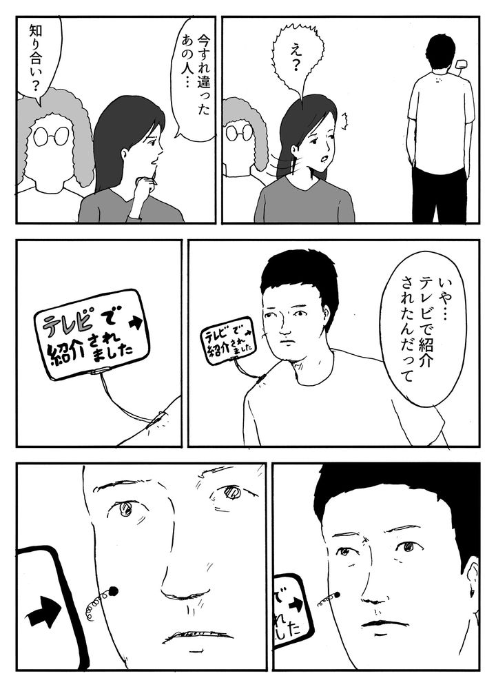 女性が驚いて振り返ったワケは、男性の肩に付いていた「テレビで紹介されました」という札でした。一瞬すれ違っただけでは何がなんだかわかりませんが、その札に書かれた矢印を目で追っていくと、バネのようにくるくるカールした毛の生えた、大きなほくろが…!
