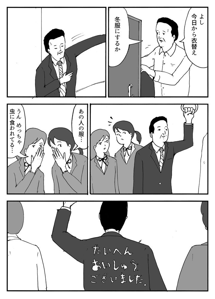 つい、自分のスーツは虫食われてないかな、と確認したくなってしまう創作漫画でした!
