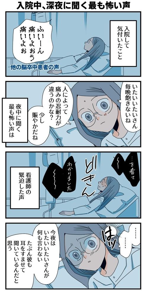夜の病院というとおばけの話かと思いきや、リアルな現実を映し出す声が1番の恐怖だったのですね。不安の多い入院生活では難しいかもしれませんが、夜はよく寝てやり過ごすのが、体にも心にもよさそうです…!