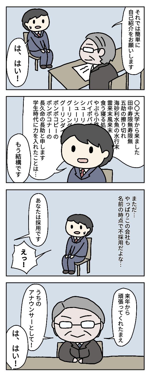 名前が長すぎるせいで、また不採用かと肩を落とす学生でしたが、面接官からは「採用です」の一言が。この会社のアナウンサーとして採用してくれるというのです。