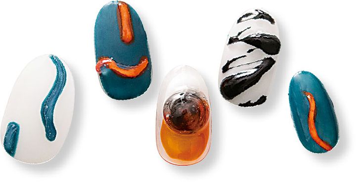 くすみブルー、マスタード、ローズゴールドを余白を作りながらランダムに塗り、こなれた爪先に。