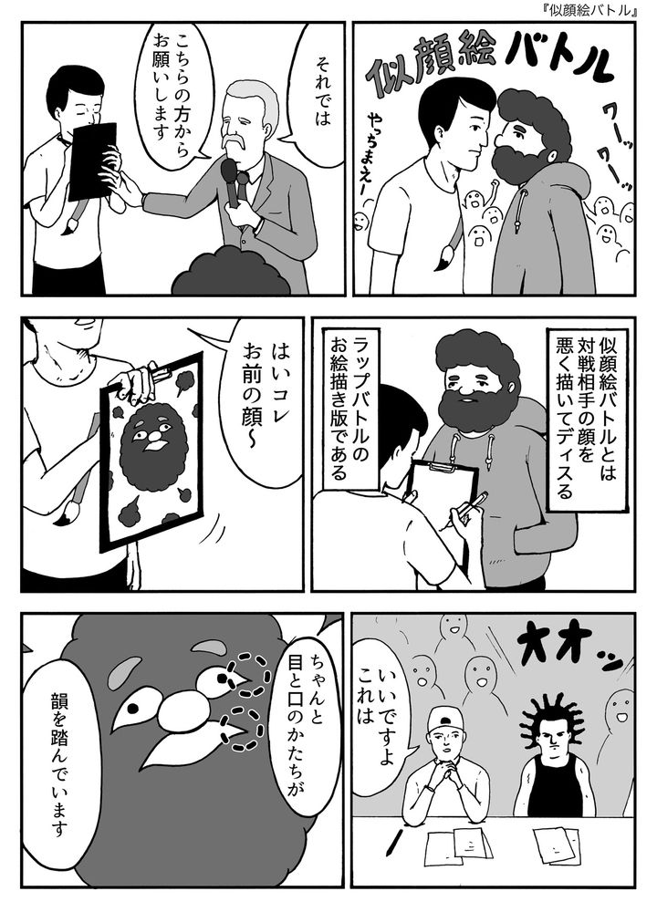このバトルは、対戦相手の顔を悪く描く、ラップバトルのお絵描き版のようなものだそうです。主人公の男性は、髭と髪の毛がもじゃもじゃの対戦相手の顔を、大きな毛玉のように描きました。