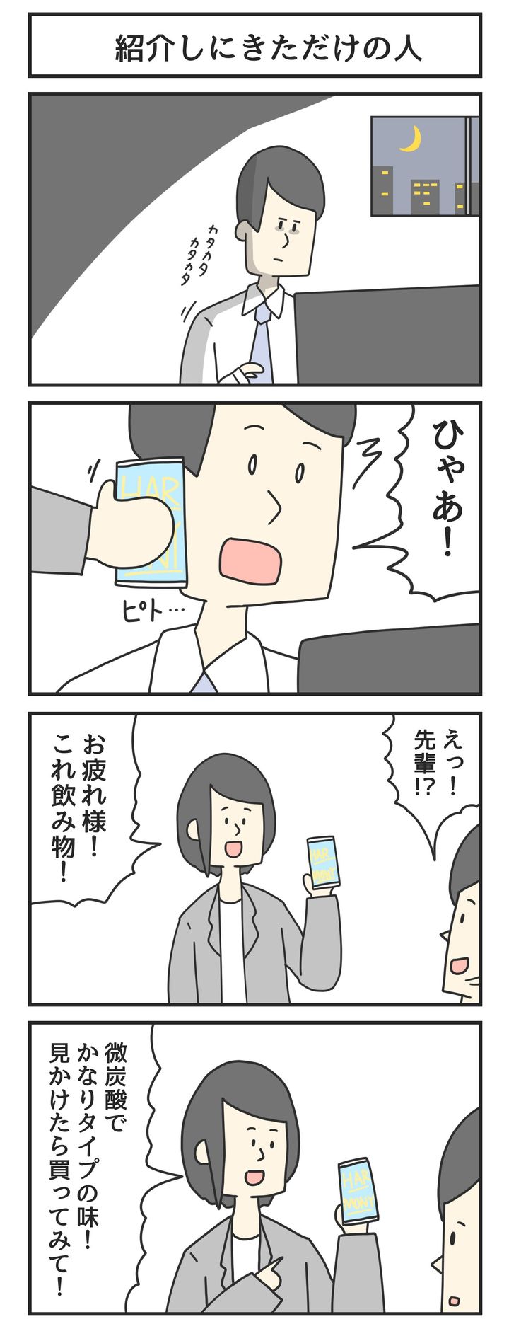 残業で疲れている男性にねぎらいの差し入れをしてくれたのかと思いきや、「微炭酸でかなりタイプの味!見かけたら買ってみて!」という単なるお知らせでした…!