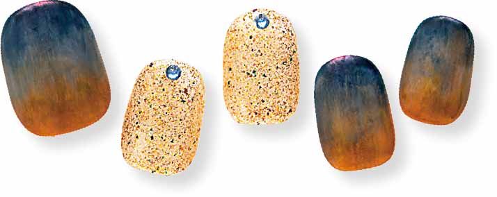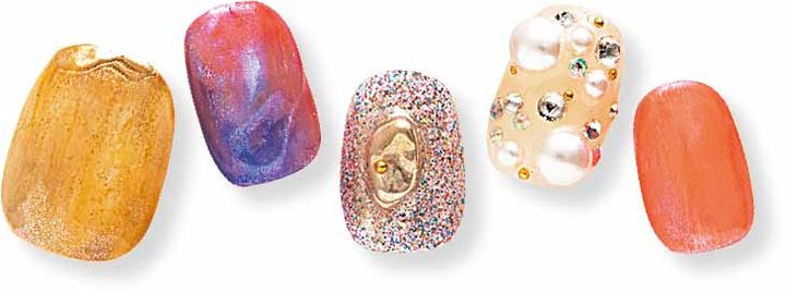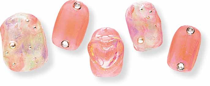 夕焼けが海に反射して煌めく幻想的な風景をイメージ。見る角度で変化するぷっくりパーツやオーロラの輝きは波のゆらめきのよう。1本1本違うアートでワクワク感を。(担当/安藤瑠花さん)