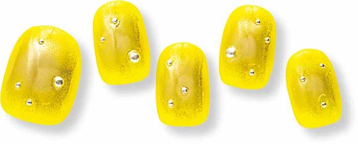 少し蛍光感のある元気なイエローで、夏を先取り!ベースにイエローを塗り、それぞれの中心にはシルバーのミラーパウダーをぼかしながら擦ることで、こなれた質感に。(担当/佐藤果歩さん)