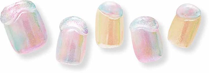 カラフルな透けカラーをランダムに塗り、オーロラをかけて立体的に。ちゅるんとした透明感のあるハートや、シルバーストーンがアクセントになりキュートさMAX。(担当/佐藤果歩さん)