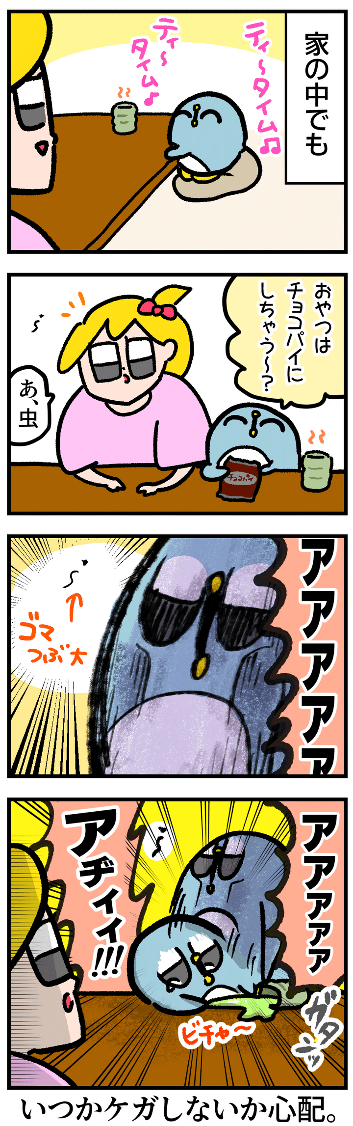 そして家の中でお茶をしながらくつろいでいるときも、モモコさんが小さな虫を見つけて「あ、虫」とつぶやいただけで、この世の終わりのように絶叫し、熱々のお茶をこぼしてダメージをくらうのでした…!