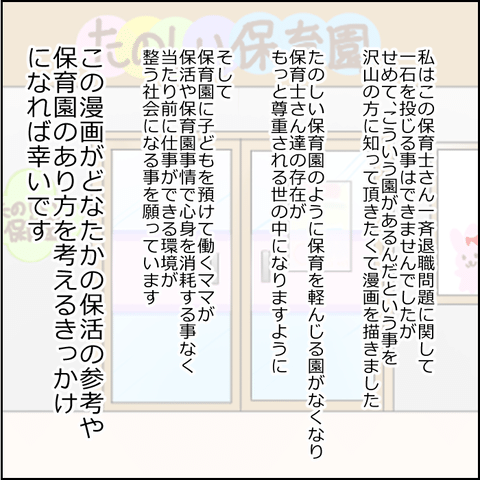 さらに半年後、例の保育園は驚きの展開を迎えていたことを知った鳥野さん。なんと無責任な園長が突然いなくなり、当時の事務員さんが園長になったと聞かされます。そこで、新園長にも元園長と同じにおいを感じた鳥野さん。本音では仕事を続けたかった鳥野さんですが、あのときの退園は正解だったと振り返ります。