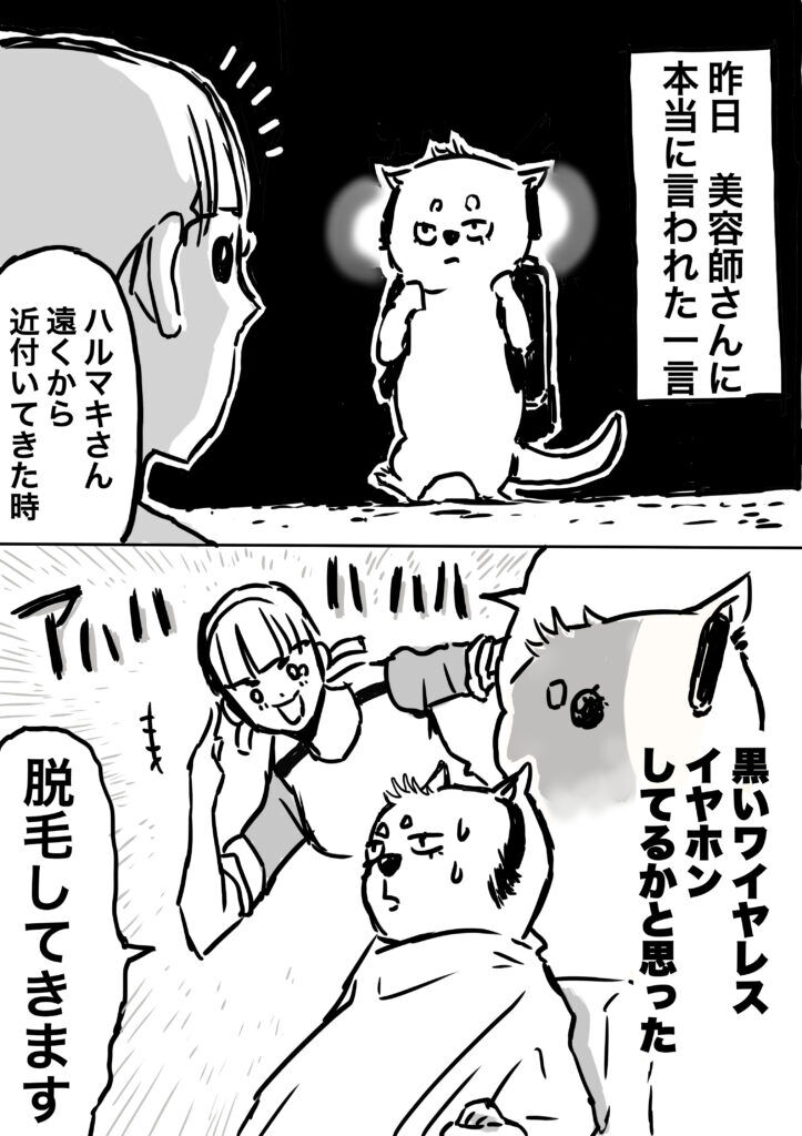 美容師の女性は「ハルマキさん 遠くから近づいてきた時 黒いワイヤレスイヤホンしてるかと思った」と話しました。ハルマキさんの立派なもみあげが、まるでイヤホンのように見えたのです!