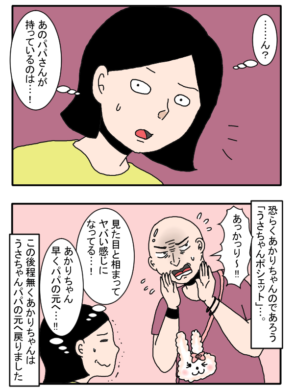 男性は、「あかり~!」と名前を呼びながら、娘を探している様子。首元には、娘のものと思われる、「うさちゃんのポシェット」がかかっていたそうです。コワモテなビジュアルと、首から下げた可愛らしいポシェットとのギャップに、笑いを堪えるワンタケさんでした…。