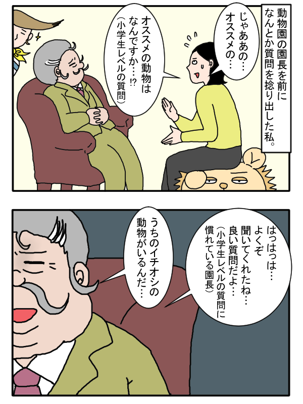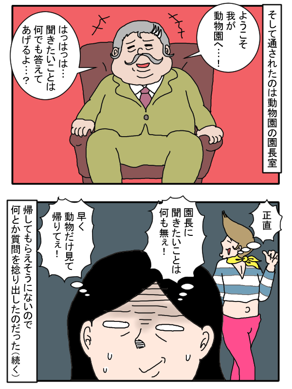 動物を見るのかと思いきや、紹介されたのは園長! 「聞きたいことは何でも答えてあげるよ」と言われたものの、何も聞きたいことが浮かばないワンタケさんは、動物だけ見て早く帰りたくなってしまいます。
