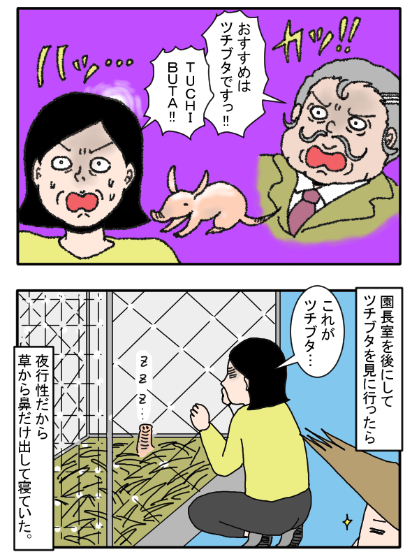 仕方なく、おすすめの動物を聞いたところ“ツチブタ”と答えられたそうです。しかし、ツチブタは夜行性。ツチブタを見に行くと、草から鼻だけ出して寝ている姿を見ることができたのでした。