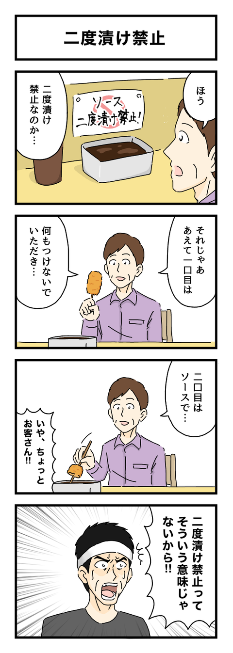 串揚げを出す店に行った男性が、「二度漬け禁止」の貼り紙を見つけて…?