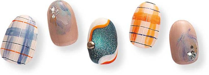 チェック柄をかすれ気味のインク風にアート。オレンジとブルーの反対色の組み合わせで、カジュアルな印象に。チェック柄に透け感があるから、重たくなりすぎず軽やか。(担当/中山絵梨子さん)