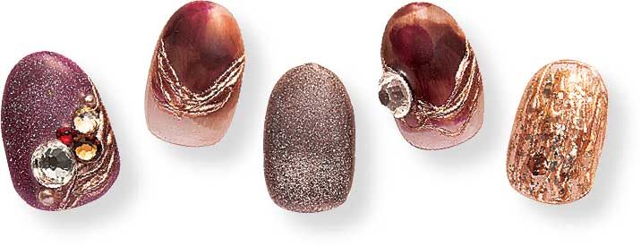シアーボルドーで、ひと味違うレディライクなべっ甲ネイルに。ジュワッと滲む落ち着いた色に、大粒ストーンやミラーなどのキラキラをプラスして、爪先からドレスアップを。(担当/中山絵梨子さん)