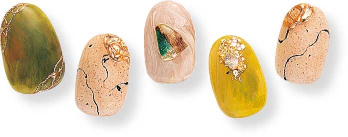 ここ最近じわじわと人気が上がっているピスタチオカラーがアクセント。色の濃淡やひと癖あるニュアンスアートで人とかぶらないデザインに。ゴールドメタルで高級感がUP。(担当/中山絵梨子さん)