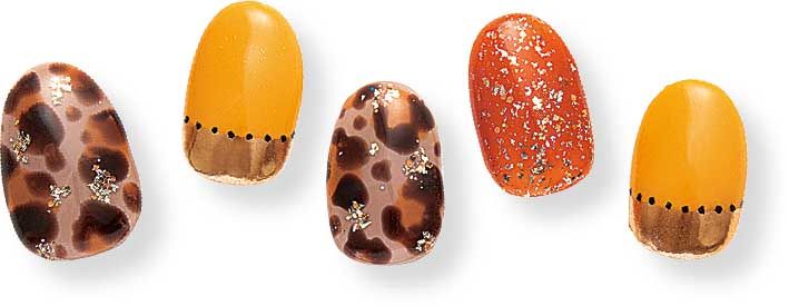 秋に取り入れたいレオパード柄。柔らかい色でアニマル柄を描いたら、金箔をさりげなくのせて大人の雰囲気に。紅葉のような暖かみのあるイエロー&オレンジで秋っぽく。(担当/中山絵梨子さん)