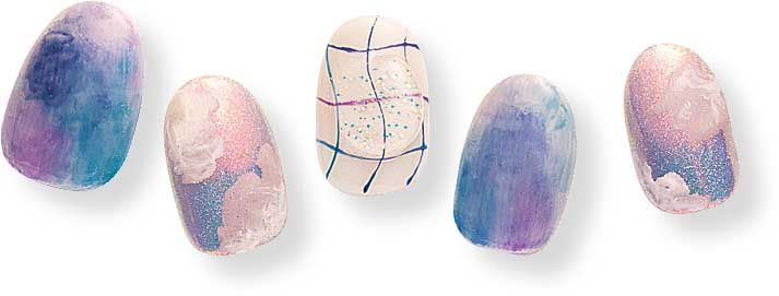 ブルーやパープルの色の境目がモヤッと重なり幻想的な爪先に。オーロラミラーで奥行き感もアップ。モヤッとネイルに合わせて、中指のチェックは流れるような歪みを表現。(担当/中山絵梨子さん)