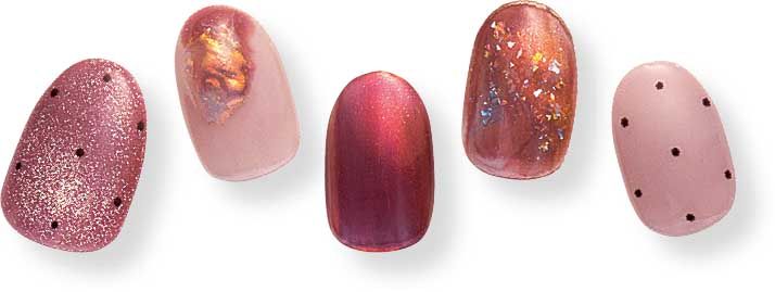 定番人気のドット柄は、ちびドットにすることで、甘くなりすぎず、大人レトロな雰囲気に。ぶどうのようなジューシーカラーに、ミラーやオーロラでニュアンスを変えて遊び心を。(担当/中山絵梨子さん)