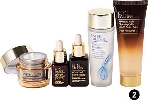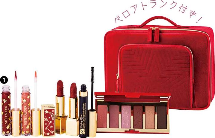 <セット内容>【写真1】右から:リミテッド エディション アイシャドウ パレット セレスチャル グラム、ダブル ウェア スマッジ プルーフ マスカラ、リミテッド エディション リップスティック コレステレーション ローズ・ガーネット ディザイア、リミテッド エディション リップ グロス クリスタル ヌード・ルビー クオーツ 【写真2】右から:アドバンス ナイト クレンジング ジュレ 50ml、マイクロ エッセンス ローション BF 50ml、アドバンス ナイト リペア SMR コンプレックス 15ml・7ml、シュープリーム プラスYPクリーム 15ml、コスメティック バッグ(サイズ/約W30×H22×D12cm)
