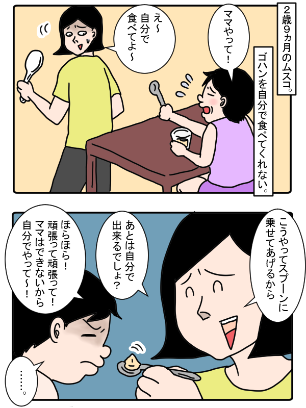 「しっかりして」と言いたいのはワンタケさんの方ですが、2歳児は大人には理解できない要求をしてくるものですよね。自分で食べられるようになったとはいえ、まだまだ2歳。お母さんに甘えたい気持ちと自立心が交錯する難しい時期ですね。