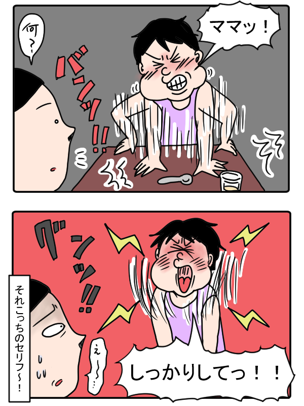 ごはんをスプーンに乗せるところまではやってあげ、自分で食べるよう促すワンタケさん。しかし、逆にイライラさせてしまったようで、ムスコくんは「しっかりしてっ!!」とワンタケさんにダメ出ししたのでした…。