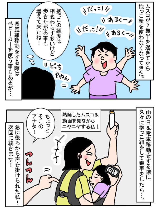 雨の日に電車に乗ることになったため、ベビーカーではなく抱っこ紐で移動することにしたワンタケさん。電車内でムスコくんが寝ていたため、スマホで動画を見ながら過ごしていました。すると後ろから「ちょっとそこのアナタ!」と声を掛けられました。ムスコくんを抱っこしているワンタケさんを見かねた女性が、席を譲ってくれるというのです。