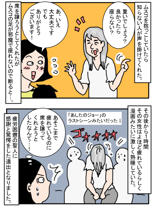 座席に座るとムスコくんの足が隣の人に当たってしまうと思い、お礼を言いつつ断ったワンタケさん。するとその女性は、まるで燃え尽きた漫画の主人公のように座席に座ってうなだれ、大きないびきをかきながら1時間ほど眠り続けたのでした…。