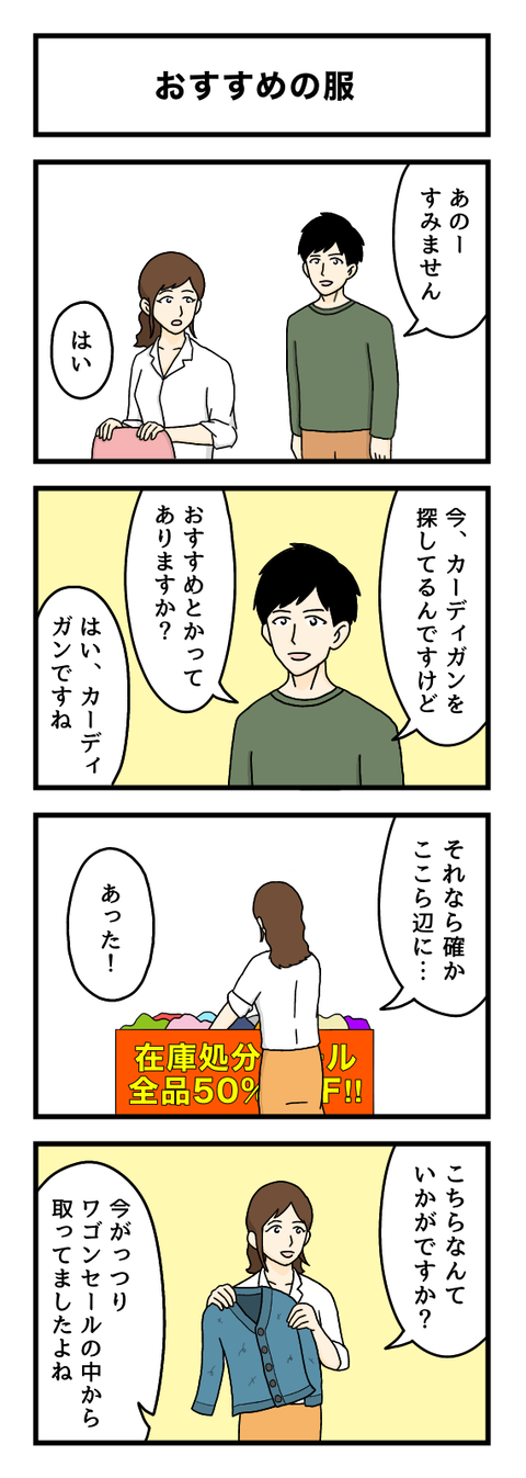 主人公が探していたのは、カーディガン。おすすめを聞いたところ、店員の女性は在庫処分セールのワゴンの中を探し始めました。「あった!」の声とともに発見されたのは、ヨレヨレのカーディガンでした…。