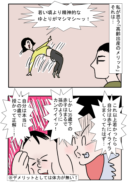 ちなみにワンタケさんによると、高齢出産のデメリットは体力が無いことだそうです。何事もメリットデメリットがあるものですよね…。