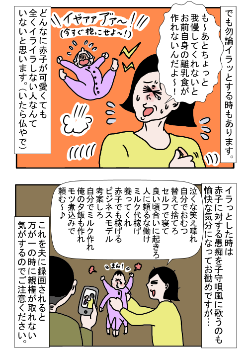 どんなにムスコくんがかわいいとはいえ、やはりイライラしてしまうこともあるもの。そんな時は、愚痴を子守唄にのせて歌うというワンタケさん。愉快な気持ちになれる一方で、夫に録画されると万が一の時に困ったことになるかも、と思うワンタケさんでした…。
