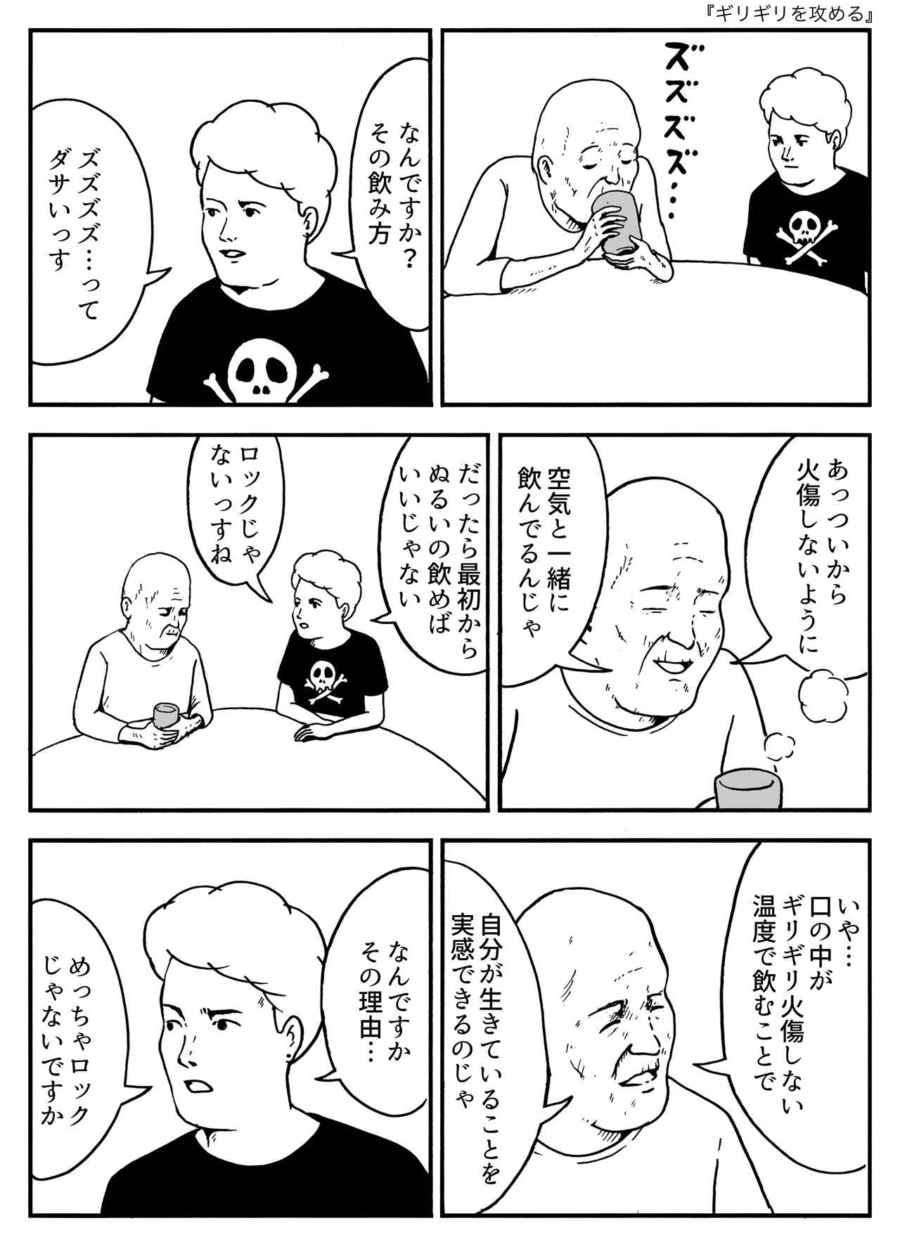 ところがおじいさんは「口の中がギリギリ火傷しない温度で飲むことで 自分が生きていることを実感できるのじゃ」と、これまた穏やかな表情で付け加えました。それを聞いた若者は、「なんですかその理由…めっちゃロックじゃないですか」とおじいさんを見直すのでした!