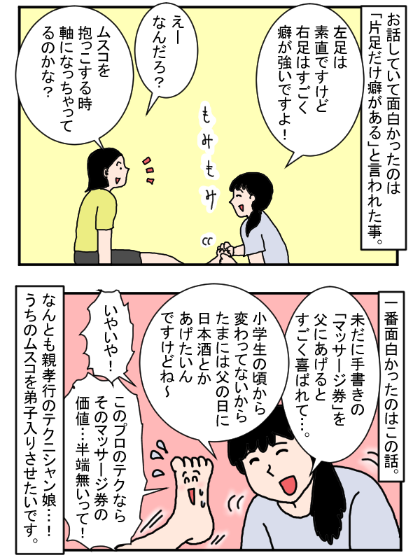 その女性は、ワンタケさんが愛用する電動足裏揉み機の存在を忘れてよだれをたらしてしまうほどのテクニックの持ち主でした。「片足だけ癖がある」などのトークも交えつつ、充実の時が流れていきます。その女性は「未だに手書きの『マッサージ券』を父にあげるとすごく喜ばれて…」と話していました。