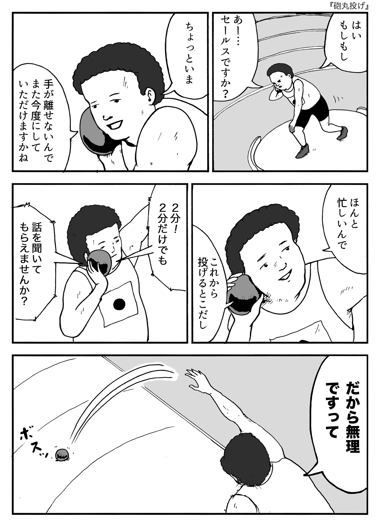 男性は穏やかな表情で「ほんと忙しいんで これから投げるとこだし」と話しています。それでも相手は「2分! 2分だけでも」と諦めません。ついに男性はしびれを切らし、「だから無理ですって」と言いながら、さっきまで耳に押し当てていた砲丸を投げたのでした!
