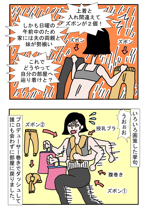 その日はあいにく夫の両親と妹が来ていたため、上半身裸で出ていくわけにもいきません。ワンタケさんは苦肉の策で、余っていたズボンを“プロデューサー巻き”にして肩に掛け、一見カーディガンのような形にして事なきを得たのでした!