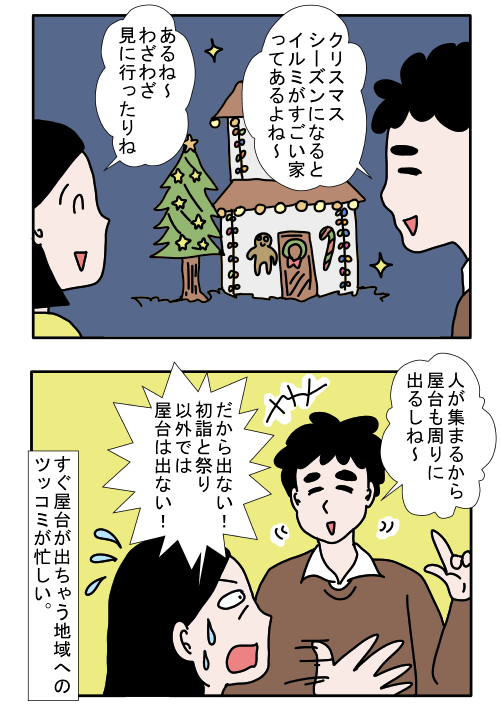 小学校の運動会や、クリスマスのイルミネーションを施した家のそばに、屋台が出ていたと話すワンタケさんの知人男性。初詣と祭り以外で屋台を見たことのないワンタケさんは、びっくりしてしまうのでした…!